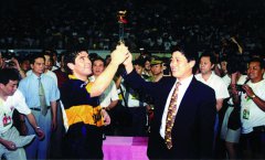 马拉多纳和刘瑞旗共同举杯向观众致意1996年7月27日,马拉多纳及阿根廷博卡青年队来到四川成都,参加“恒源祥杯”...