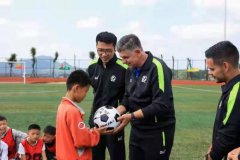 恒大足校南美青训总监吉列尔梅为小球员查皓天赠送签名足球。恒大足校供图 中新网北京5月12日电 记者从恒大足校获悉,恒大足球学校11日携手贵州毕节建立毕节(大方)足球青训中心...