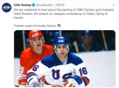 美国冰球协会讣告截图 1980年,普莱西德湖冬奥会上,马克-帕维利奇与队友们代表美国冰球队在半决赛击败四连冠的...