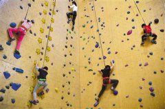 北京岩时攀岩馆,青少年们练习攀岩。1987年7月,中国登山协会派出李致新、王勇峰等5名队员和3名教练前往日本长野...