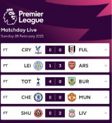 北京时间昨夜今晨,英超第26轮结束五场比赛,阿森纳逆转莱斯特城;热刺击败伯恩利;水晶宫与富勒姆、切尔西和曼...