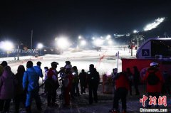 (石洪宇)当场地照明灯同时点亮,8岁的滑雪发烧友都轩铭从雪道高处顺势而下。滑雪发烧友体验夜滑 苍雁 摄 来自武...