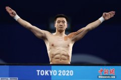 题:跳水收官,十米台“缘”梦记 中新社记者 张素 中国跳水队员曹缘的左肩缠着一块块运动贴布。当日,在东京奥...