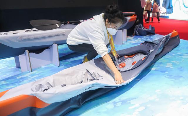 11月6日,工作人员在进博会消费品展区的迪卡侬展台演示可折叠皮划艇如何安装。新华社记者 丁汀 摄